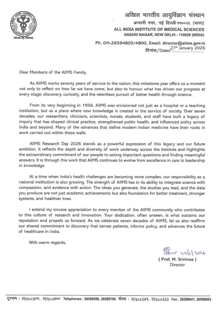 New Delhi: The All India Institute of Medical Sciences (AIIMS), marked AIIMS Research Day 2026 with a reflective and forward-looking message from its Director, Prof. M. Srinivas, commemorating 70 years of the institution’s contribution to medical science and public health in India.