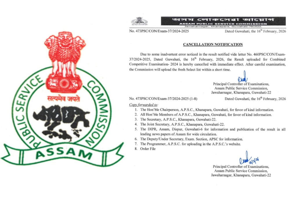 Guwahati: The Assam Public Service Commission (APSC) has once again come under intense scrutiny after it withdrew the results of the CCE 2024 mere hours following their announcement on February 16, 2026. Citing an “inadvertent error” in the select list.