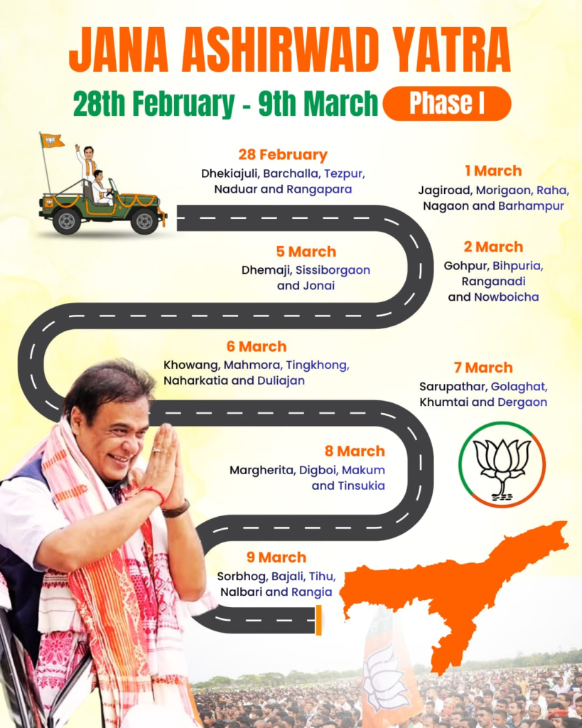 Guwahati: Assam Chief Minister Himanta Biswa Sarma will begin the Jana Ashirwad Yatra on 28th February, aiming to meet people across the state and seek their blessings ahead of the 2026 elections. The first phase of the Yatra will span 28th February to 9th March, covering important towns and districts.