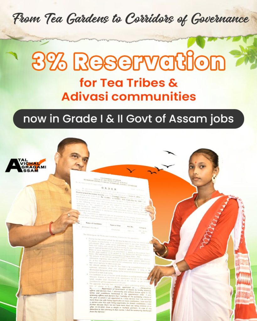 Guwahati: In a step aimed at strengthening inclusive governance, the Government of Assam has extended a 3 percent reservation for Tea Tribes and Adivasi communities to Grade I and Grade II posts in the state services. The decision is expected to improve representation in higher administrative positions and create greater access to leadership roles within the government.