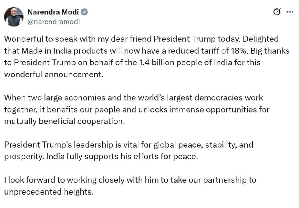 Welcoming the announcement, Modi wrote, “Wonderful to speak with my dear friend President Trump today. Delighted that Made in India products will now have a reduced tariff of 18%. Big thanks to President Trump on behalf of the 1.4 billion people of India for this wonderful announcement.”