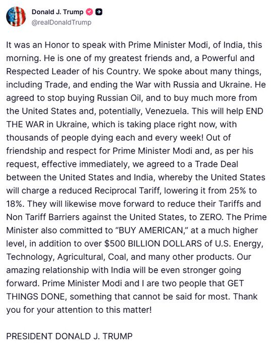 In a social media post, Trump said the deal was reached “out of friendship and respect for Prime Minister Modi,” adding that India has agreed to increase purchases of American energy, technology, agricultural and other products, with commitments reportedly exceeding $500 billion. He also claimed that India would reduce non-tariff barriers and scale back its imports of Russian oil.