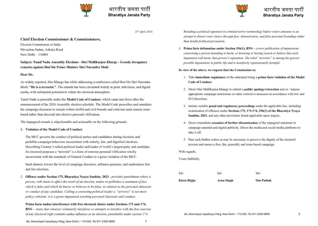 The complaint, filed by senior leaders including Kiren Rijiju, Arun Singh and Om Pathak, argued that the remark could “vitiate the electoral atmosphere” and disrupt fair campaigning. It also invoked provisions of the Bharatiya Nyaya Sanhita (BNS), citing potential offences such as defamation and undue influence on voters.