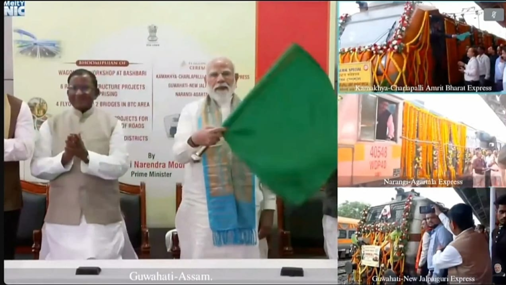 In the railway sector, the foundation stone was laid for a Rail Wagon Workshop at Bansbari, which is expected to generate employment and strengthen rail infrastructure in the region. The Prime Minister also flagged off three new Amrit Bharat and Express trains: the Kamakhya–Charlapalli Amrit Bharat Express, Narengi–Agartala Express, and Guwahati–New Jalpaiguri Express, aimed at improving interstate travel and facilitating trade.