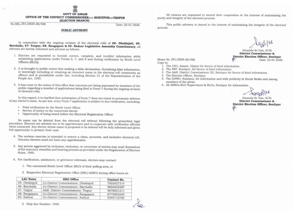 Sonitpur: The Sonitpur district administration has issued a public advisory in connection with the ongoing process of revision of electoral rolls in respect of five legislative assembly constituencies – Dhekiajuli, Barchalla, Tezpur, Rangapara, and Naduar.