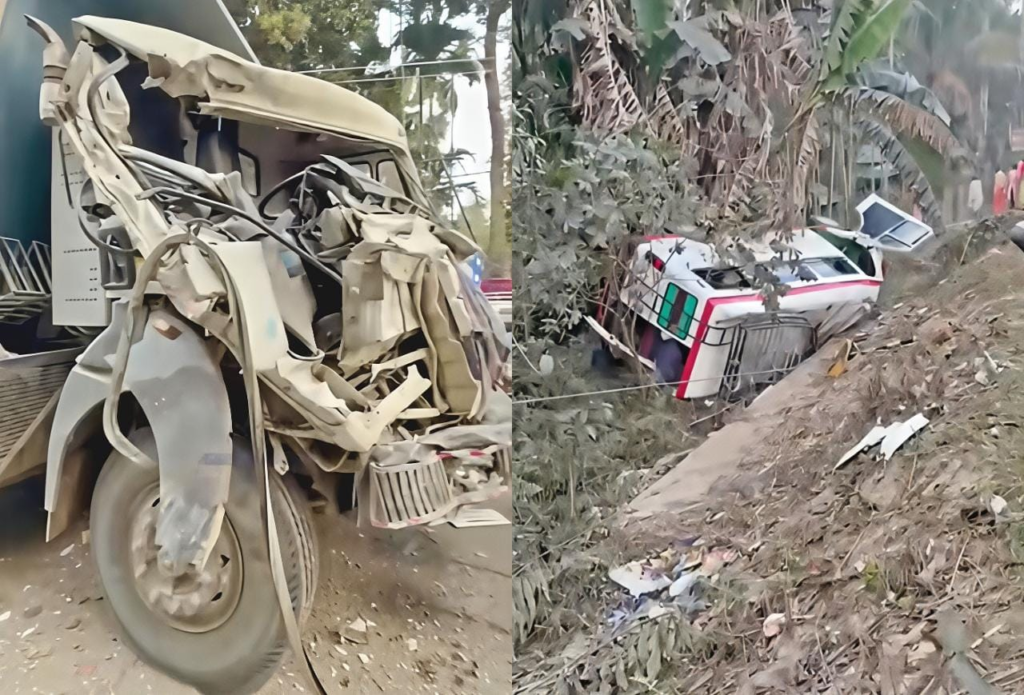 According to eyewitnesses, the mini bus was heading towards Bazar Ghat from Badarpur when a 12-wheeler tripper truck, allegedly coming from the wrong side at high speed, rammed into it, pushing the vehicle off the road. The truck driver reportedly fled the scene.