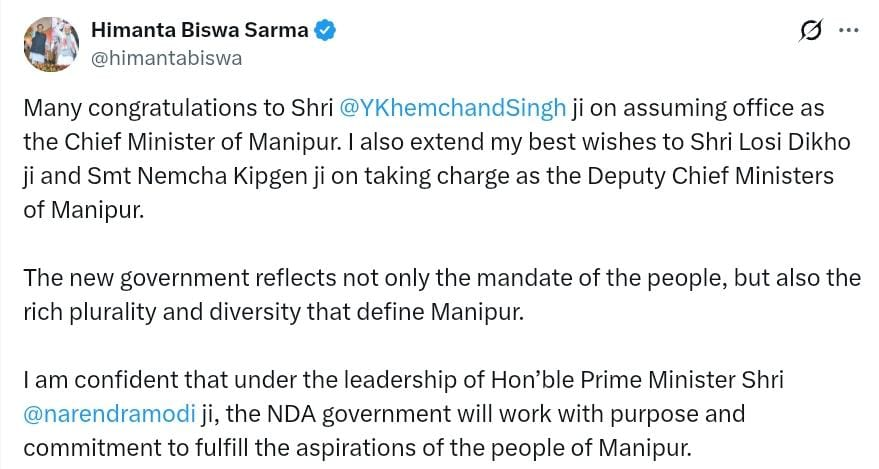 Assam Chief Minister Himanta Biswa Sarma congratulated Singh and the newly formed government, extending his best wishes to the deputy chief ministers and ministers. He said the new administration reflects the people’s mandate as well as Manipur’s rich diversity, “The new government reflects not only the mandate of the people, but also the rich plurality and diversity that define Manipur.”